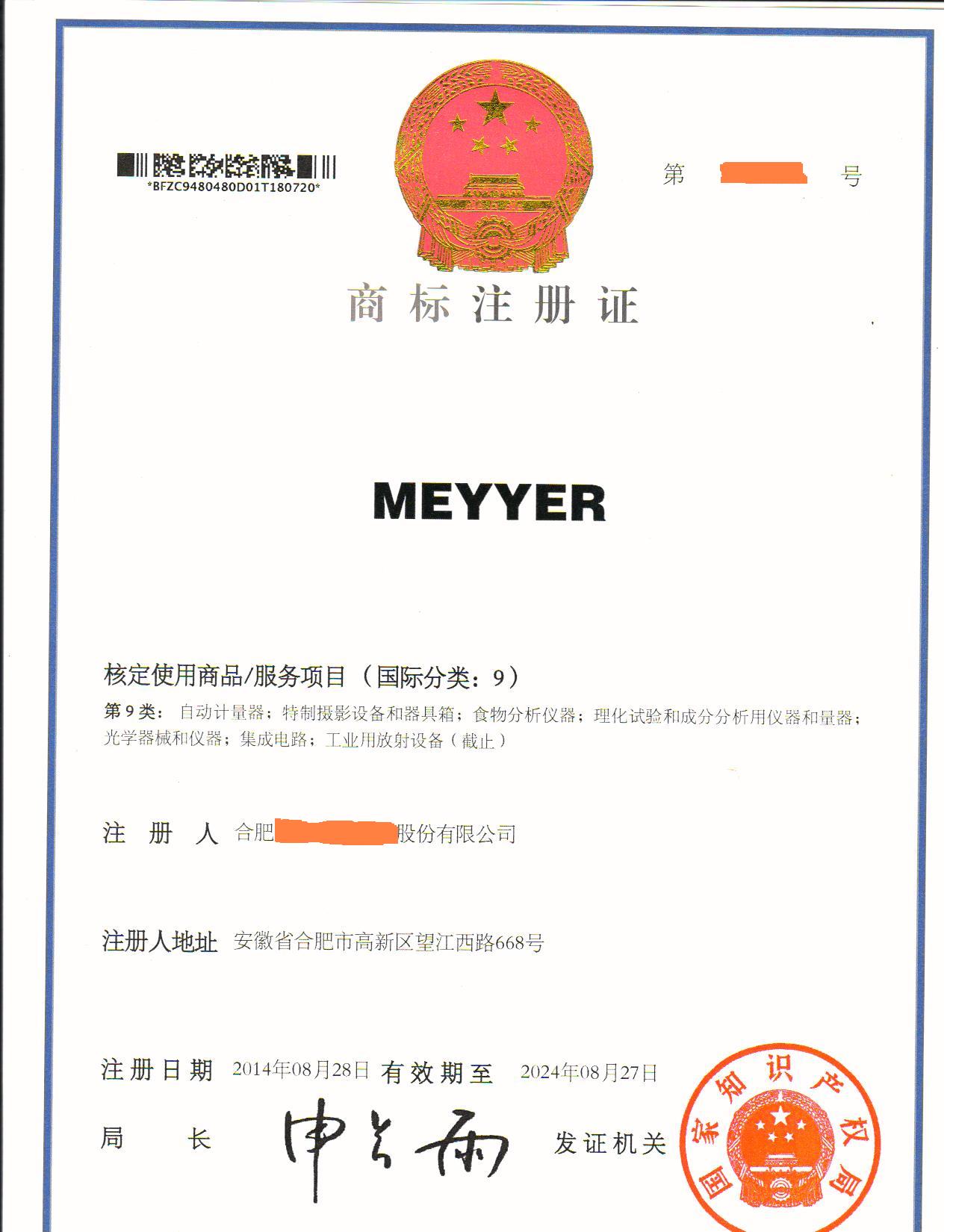 您委托我所代理商标注册申请,名称为“MEYYER”9类商标注册证已下达。